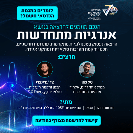 בשנת הלימודים תשפ”ו, התקיימה במכללה הרצאה מרתקת ע”י טל כהן וצדי גרינברג, בוגרים של המכללה, בנושא “אנרגיות מתחדשות – מתקנים פוטו־וולטאיים ומתקני אגירה”.