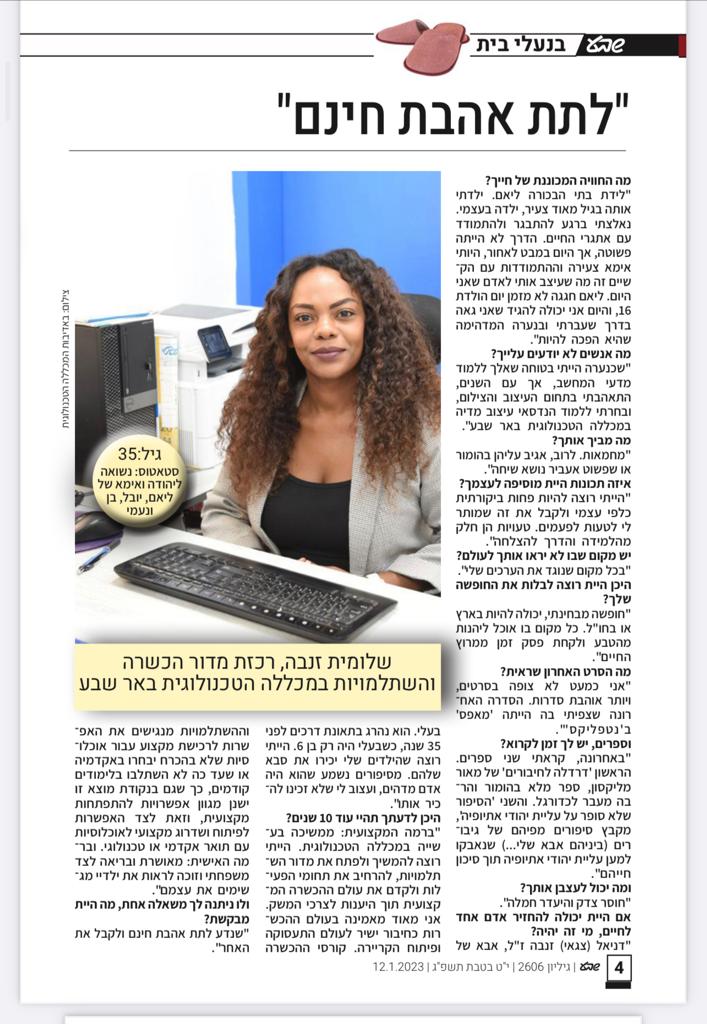 שלומית זנבה, רכזת מדור הכשרה והשתלמויות במכללה במכללה הטכנולוגית באר שבע בראיון לעיתון “שבע”.