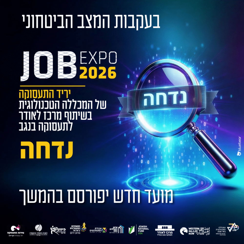 בעקבות המצב הביטחוני, יריד התעסוקה שתוכנן להתקיים ב 24.03 במכללה הטכנולוגית באר שבע בשיתוף מרכז לאודר לתעסוקה בנגב ובגליל ידחה למועד חדש.
